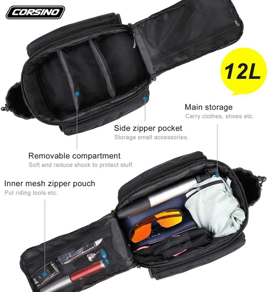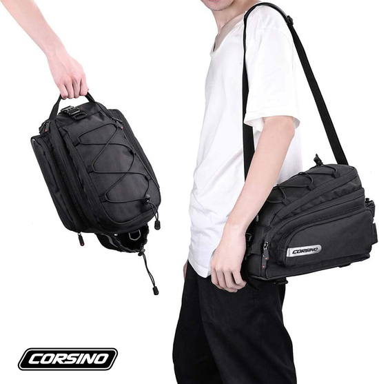 For multi-use convenience, the Corsino Adventure Trunk Cargo Bag includes a removable shoulder strap for off-bike carrying and a handle strap for hand use. This bag is your go-to gear, offering practicality and protection for all your cycling needs.