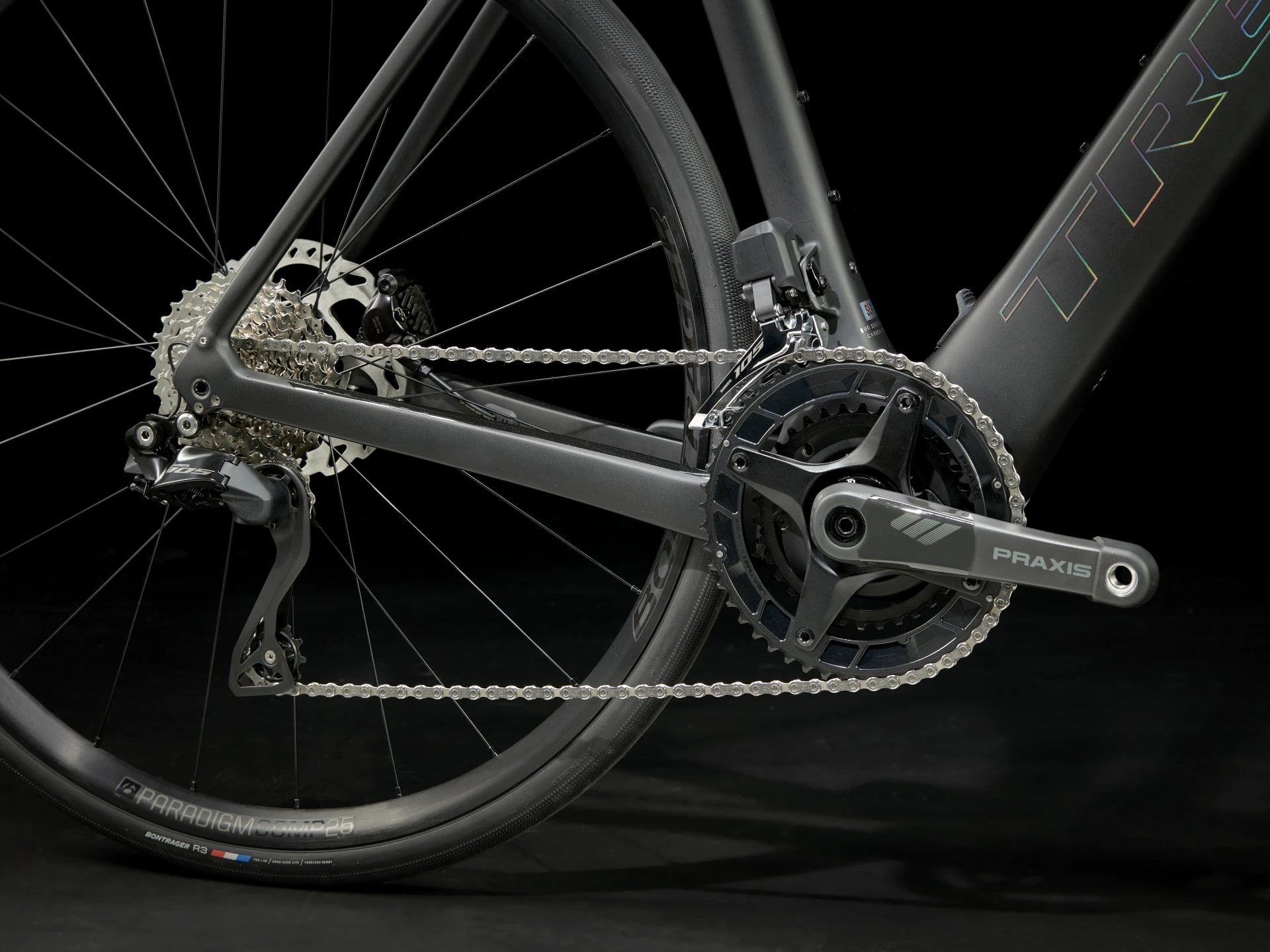 Wheels : Bontrager Paradigm Comp 25 Tubeless Ready, 700x32 mm tires (up to 40 mm without mudguards).
