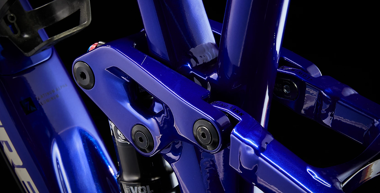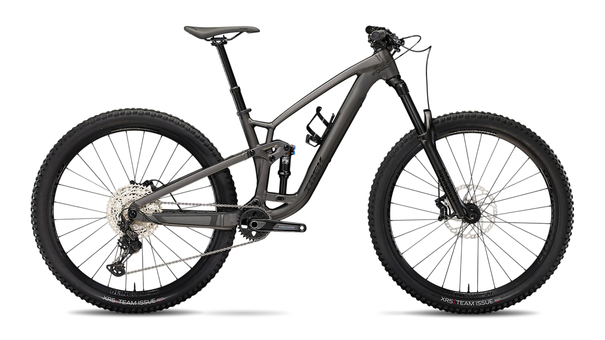 A lightweight full-suspension aluminum alloy frame with a 150mm RockShox Gold RL fork featuring a DebonAir spring for small bumps and a FOX Performance rear shock. It also boasts a Shimano SLX 1x12 drivetrain, wide Bontrager wheels with tubeless tires, and a dropper seatpost. A new adjustable geometry lets you customize your setup.