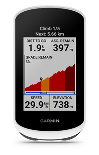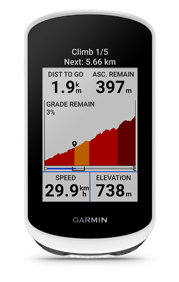 CLIMBPRO FEATURE: Display the remaining distance to climb and the gradient as you follow a route or course. This helps you gauge your effort and the time it will take to reach the summit. You can even record your climbs to review them on your device or in the Garmin Connect app.