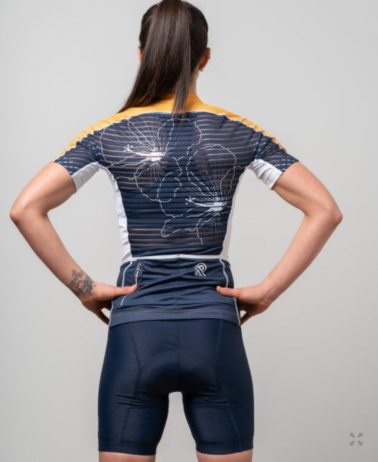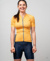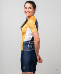 Our classic Gold short-sleeved jersey is a great way to keep the sun with you at all times during your bike rides. It's a style that will make you stand out and help you spread your passion for cycling. The full mesh back adds an incomparable touch of lightness. The details are navy blue!