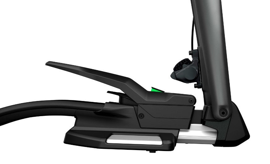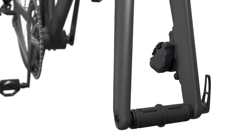 - The bike slides into the grooves of the bike rack on the fork adapter and emits a signal when it is in place.