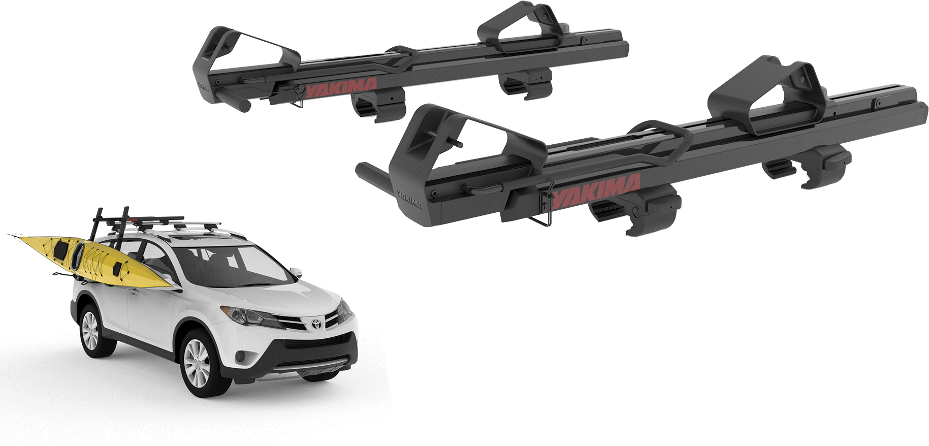 - Includes: ShowDown left and right supports, kayak seats, paddleboard seats, 2 heavy-duty straps, 2 bow/stern tensioners, and 4 RoundBar adapters